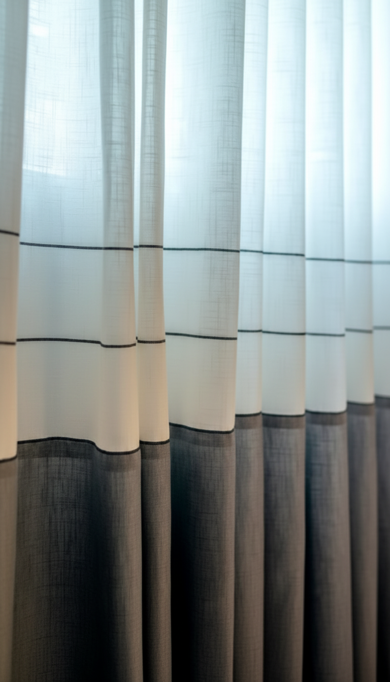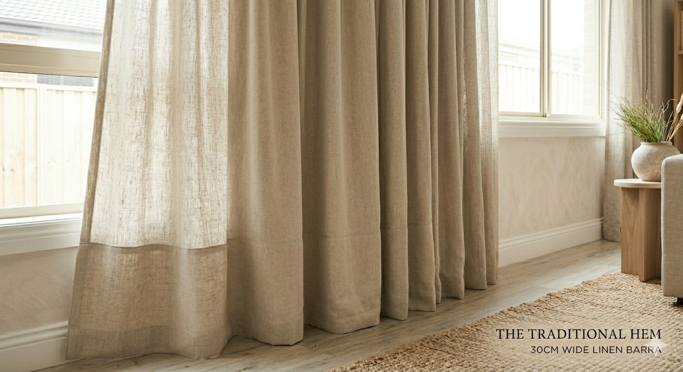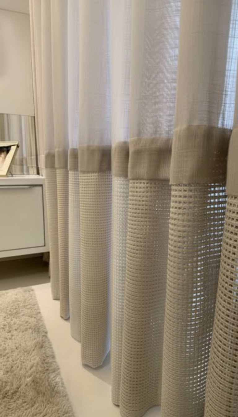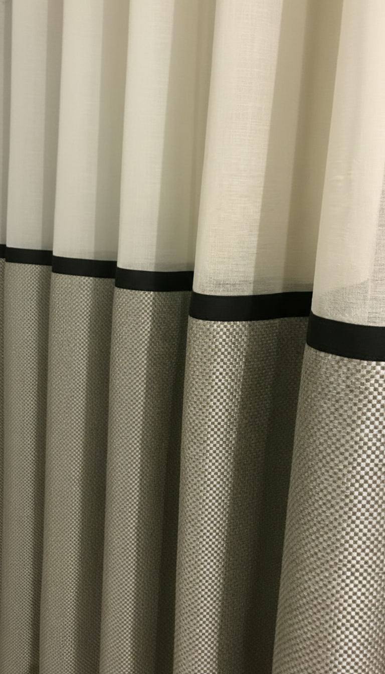 A barra larga é o acabamento na bainha inferior da cortina que confere peso, elegância e um caimento perfeito. Disponível em diferentes larguras conforme o tecido e o estilo desejado.