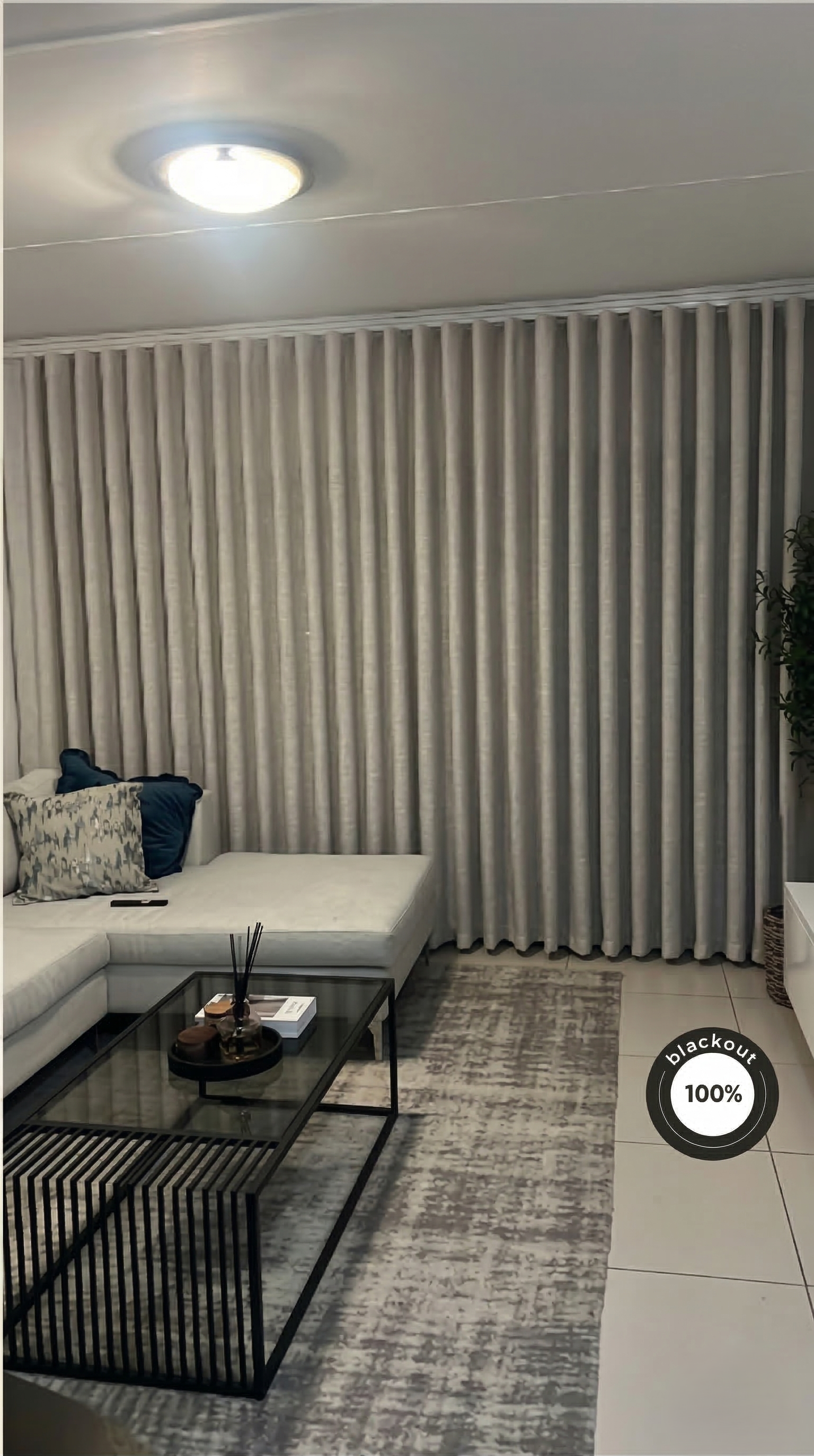 O forro blackout é aplicado na face interna da cortina para controlar a entrada de luz. Disponível em três porcentagens de bloqueio — escolha conforme o seu ambiente e necessidade de privacidade.