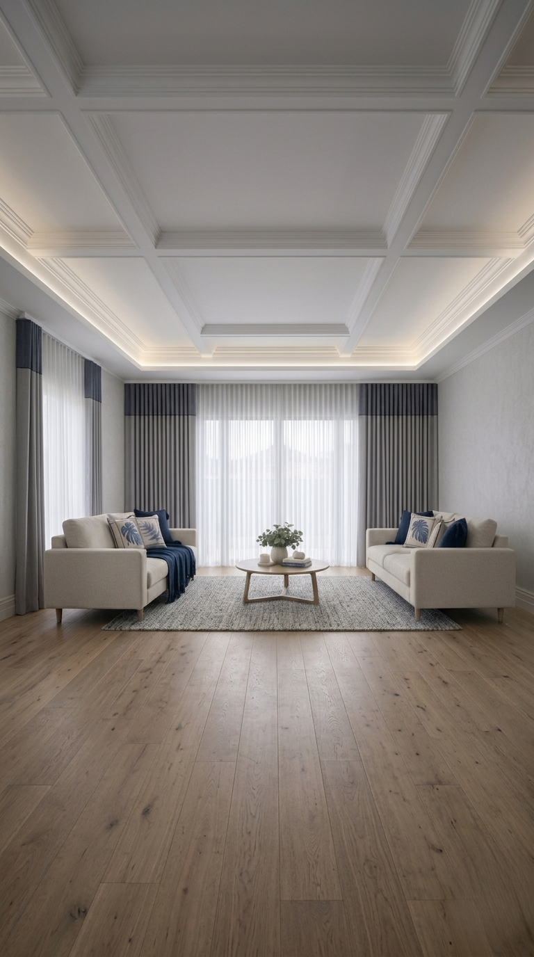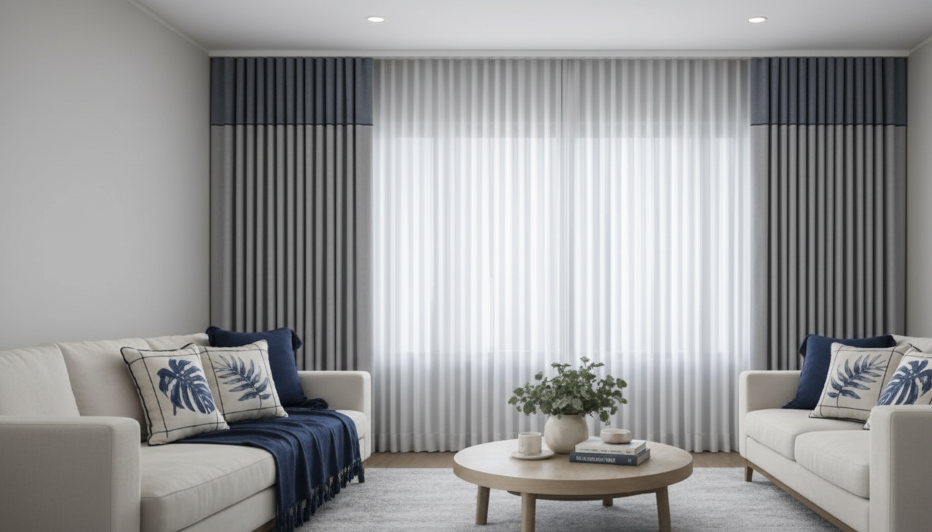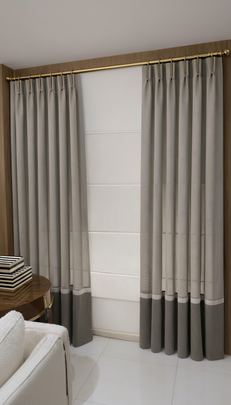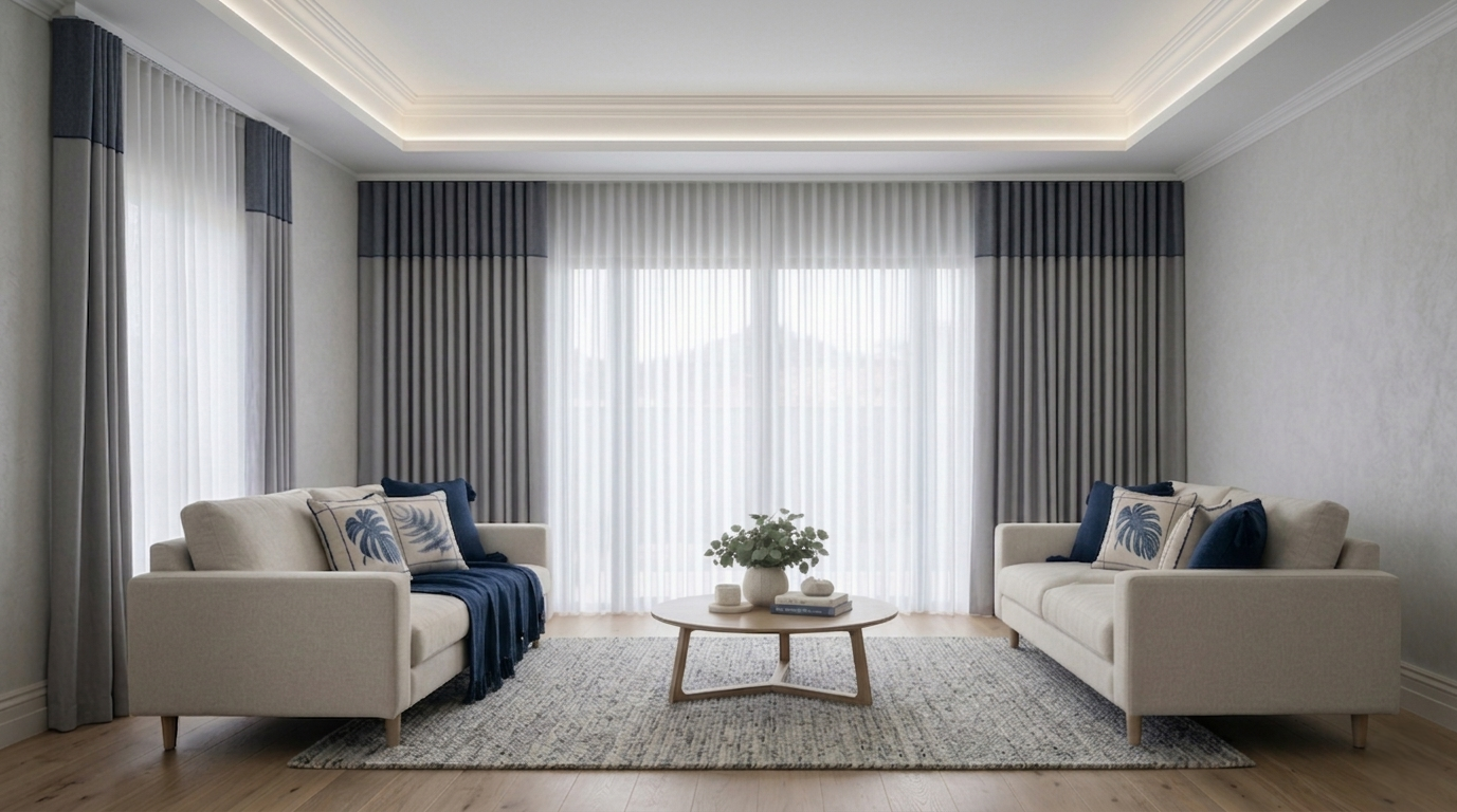 Caimento suave em ondas uniformes e contínuas. A prega wave é o estilo contemporâneo por excelência — linhas fluidas que trazem leveza e modernidade a qualquer ambiente.