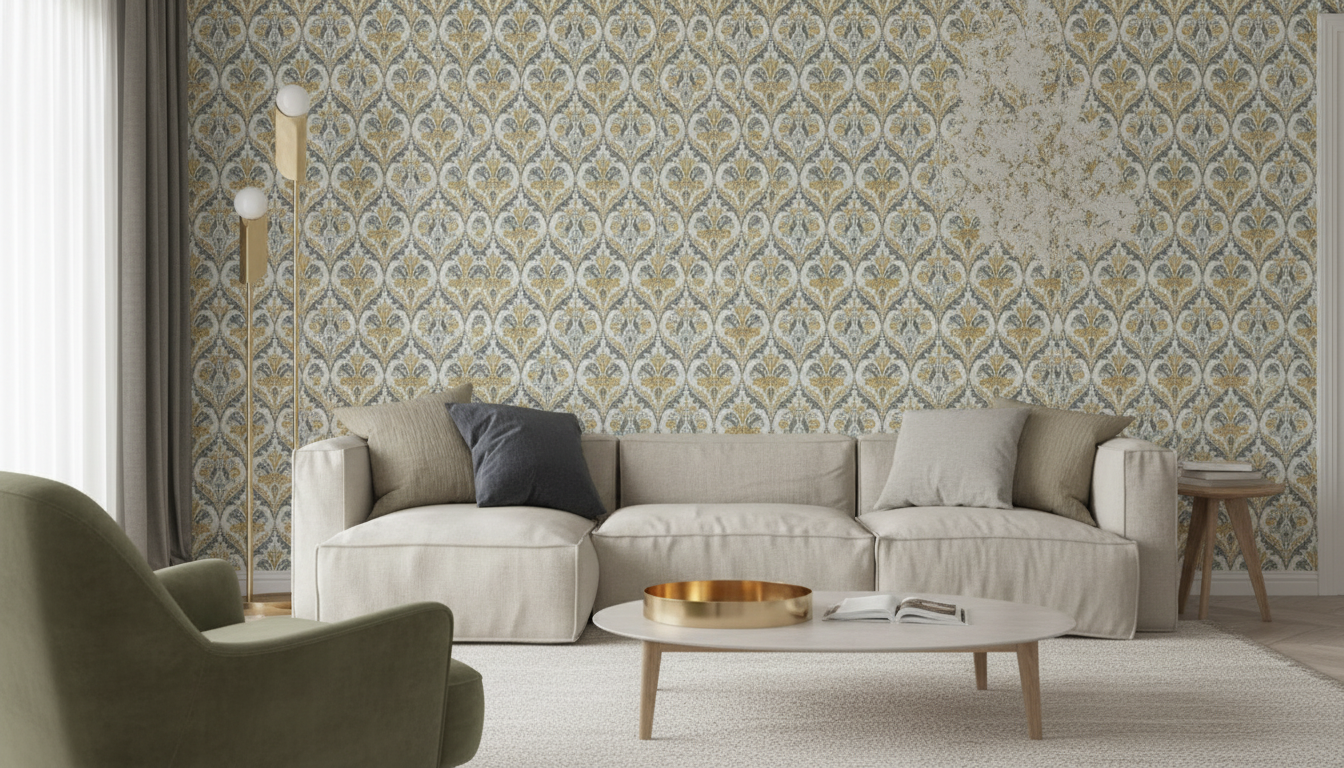 Papel de parede com revestimento de vinil (PVC), mais resistente e limpável com pano úmido, ideal para ambientes internos.