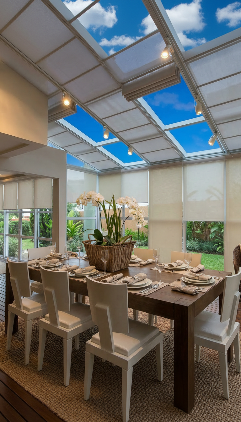 Design que nasce do teto. A Cortina VF Romana de Teto é instalada diretamente no forro, criando um acabamento impecável e contemporâneo — ideal para projetos arquitetônicos que valorizam cada detalhe.